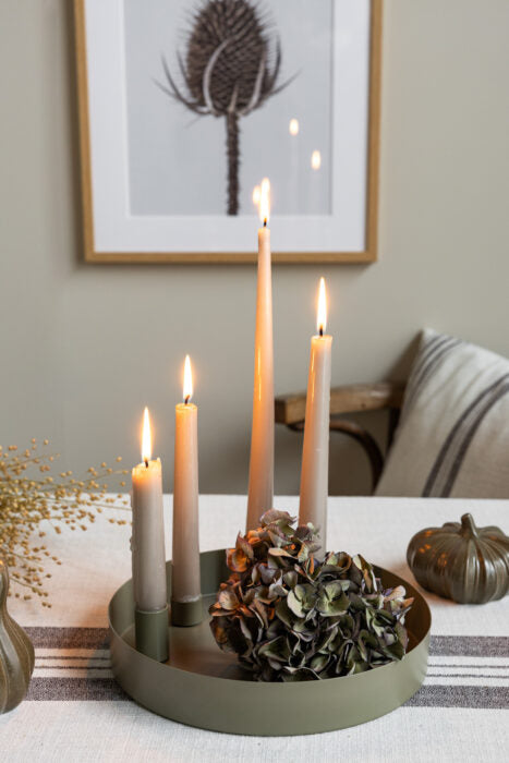 Dieses Tablett in der Farbe grün sieht umwerfend aus in der Kombination mit den LED Stabkerzen in dem Farbton Artischocke von Ester & Erik.
